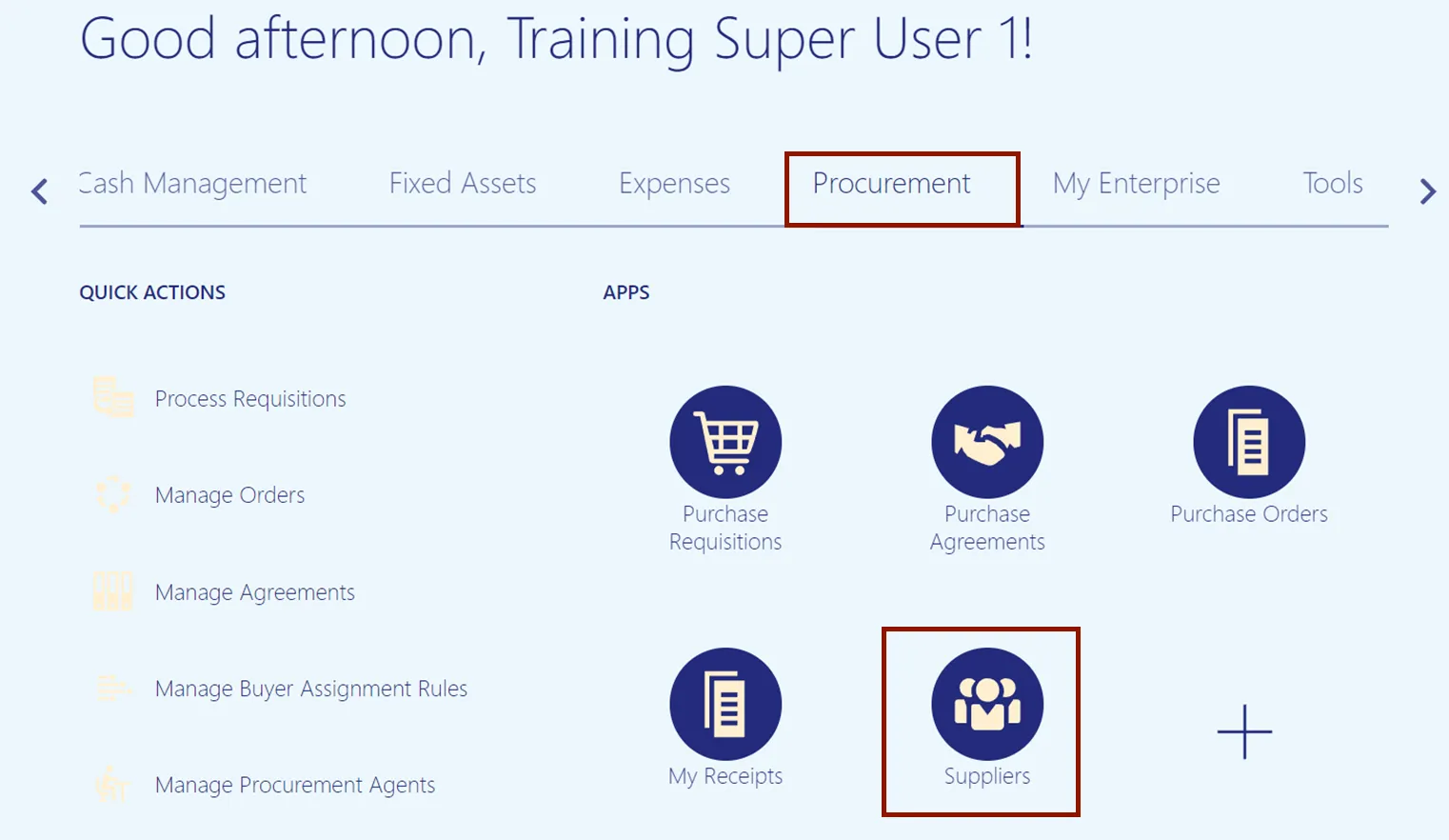 Step 2.    On the Home page, click the Procurement tab, and click the Suppliers app.