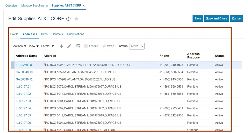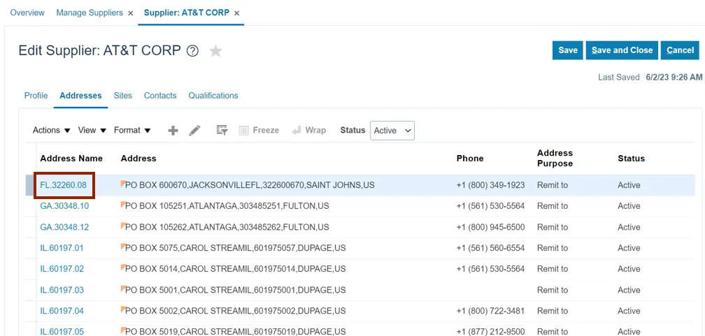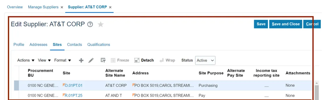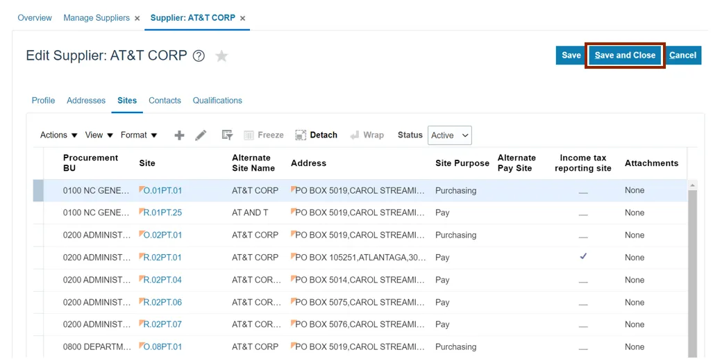 Step 12.    Validate the supplier site, click the Save and Close button.