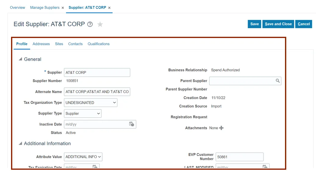 Step 6.    On the Edit Supplier page, click the Profile tab and validate the Supplier Profile information.