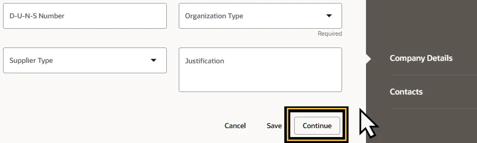 Step 5. On the Supplier Registration page, in the Company Details section, enter a value or select parameter for the fields marked with Required in the bottom right of the field.