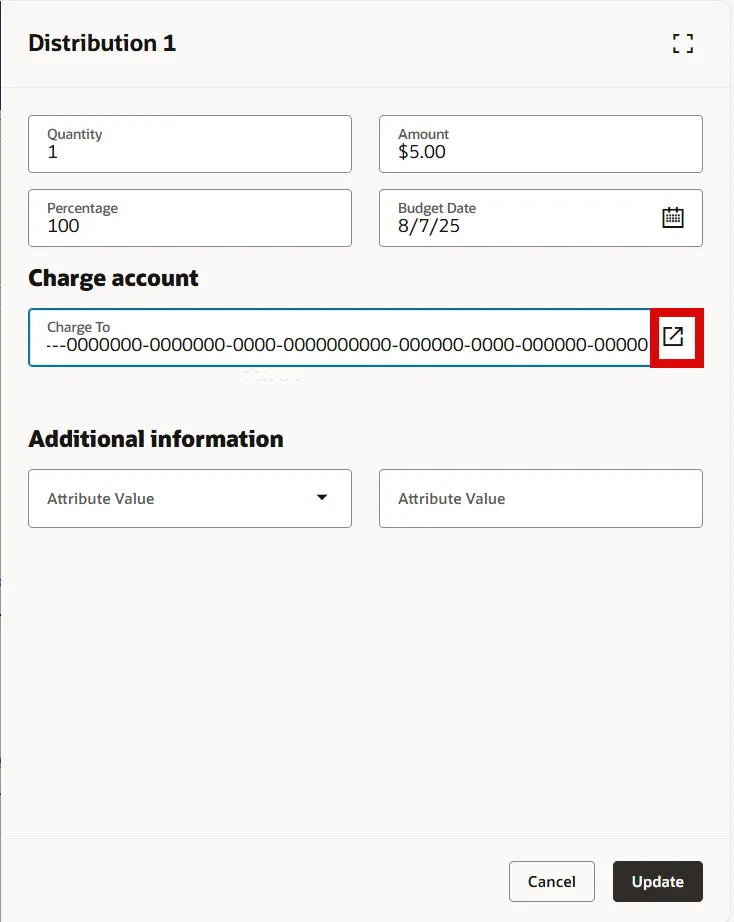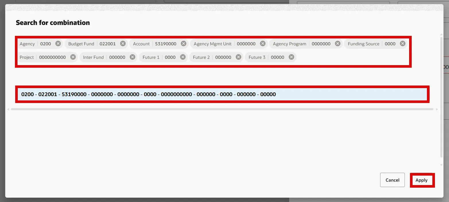 Step 10. Select Search for Combinations icon in the right corner of the Charge to field.
