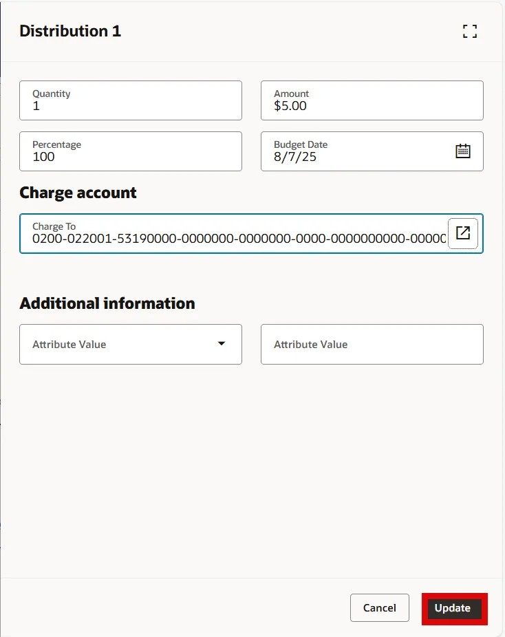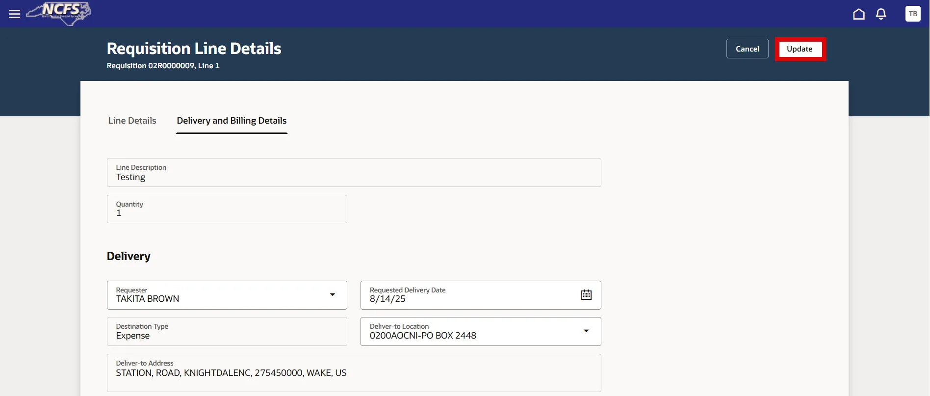 Step 13. Select the Update button in the upper right corner of the Requisition Line Details page.