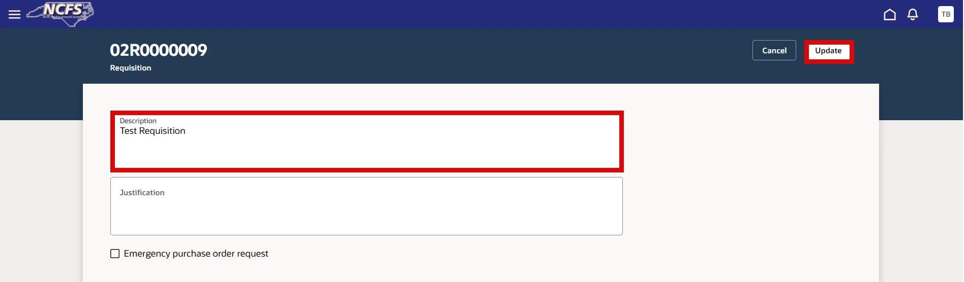 Step 14. On the Cart tab section, select the Edit icon to enter the Requisition Description, and then select the Update button.
