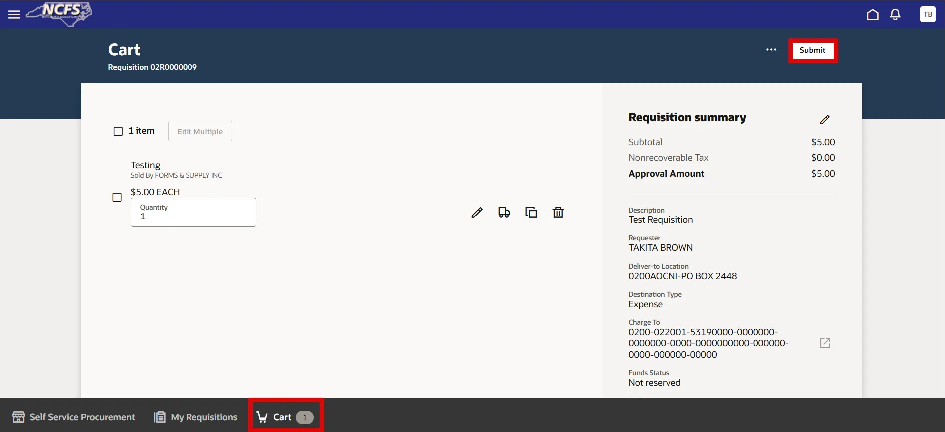 Step 15. On the Cart tab section, select the Submit button, in the upper right corner.