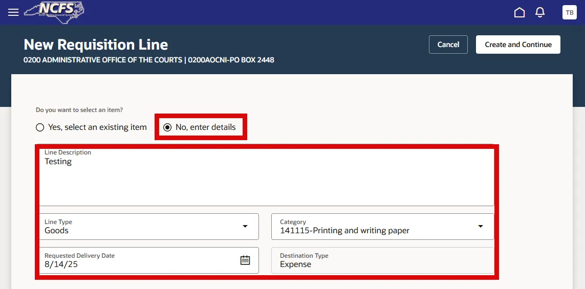 Step 4. On the New Requestion Line page, select No, enter details and then enter the details in all the required fields.