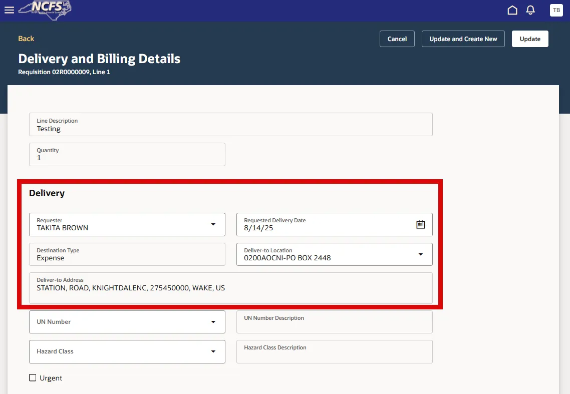Step 8. Under the Delivery section, validate the auto populated Requester, Deliver-to Location, and Requested Delivery Date fields.