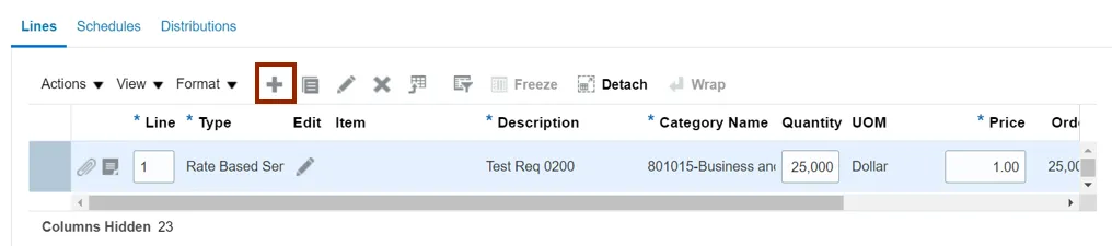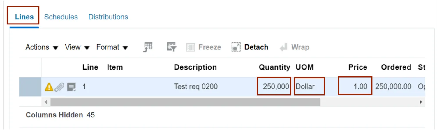 Step 7. Scroll down and validate the Lines section information. Check the Quantity, UOM, and Price fields.
