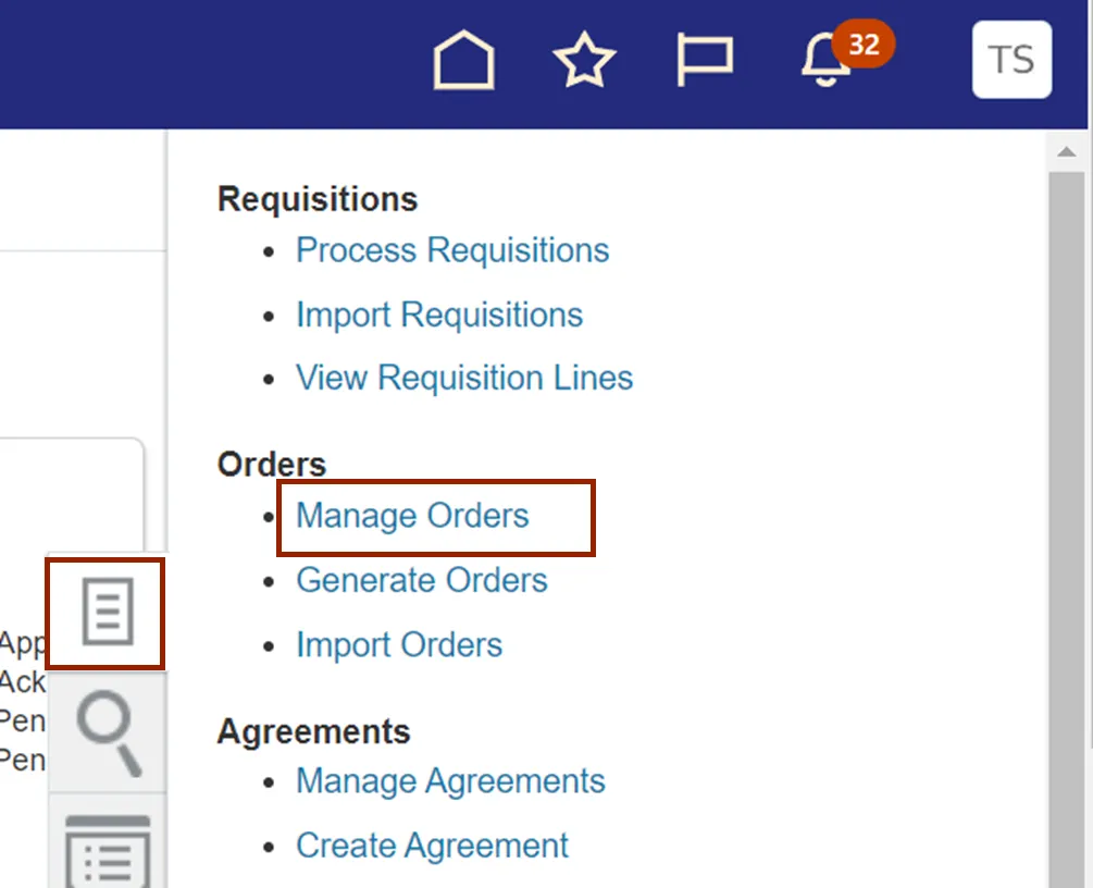 Step 3. Click the Tasks icon. Under Orders, click Manage Orders.