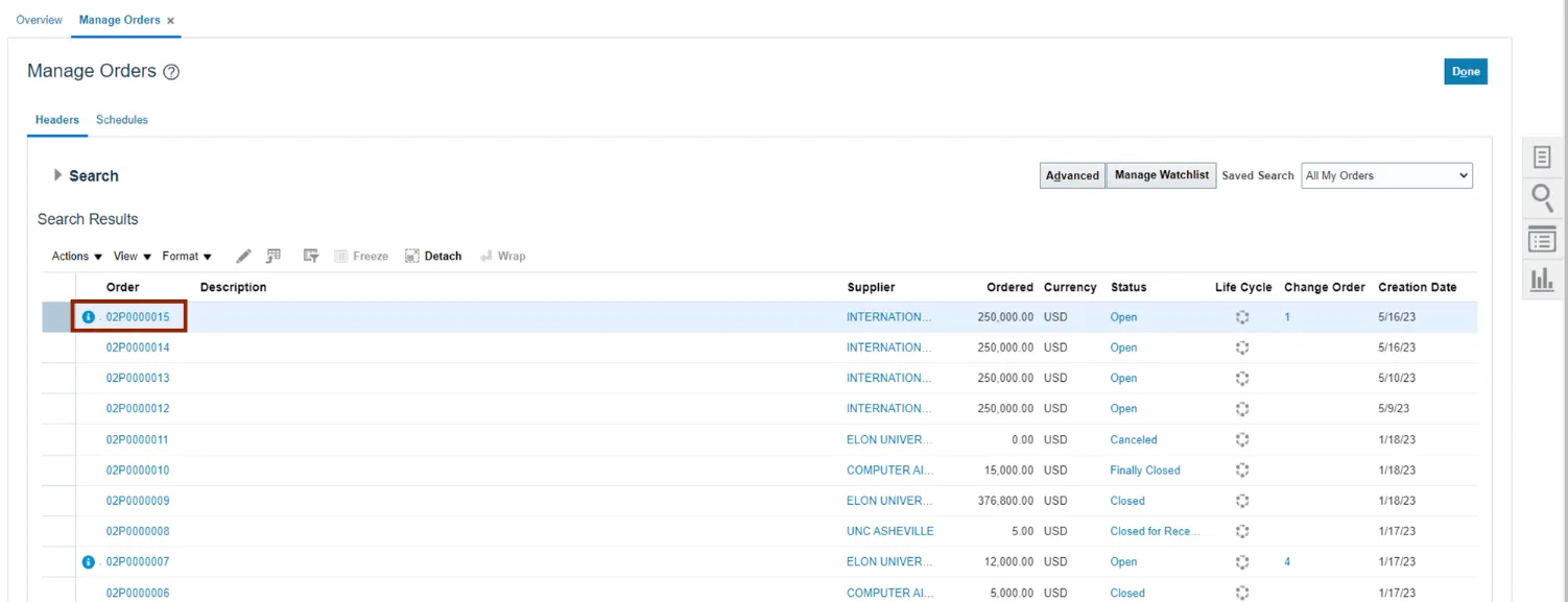Step 5. The Manage Orders Search Results page opens. In the Search Results section, click the Purchase Order.