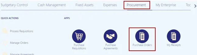 Step 2. On the Home page, click the Procurement tab and select the Purchase Orders app.