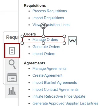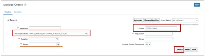 Step 4. The Manage Orders page opens. Using the search criteria, search for the purchase order you want to close. Click Search button.