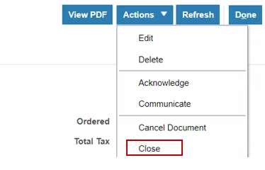 Step 6. To finally close the PO, click on the Action dropdown and select Close.