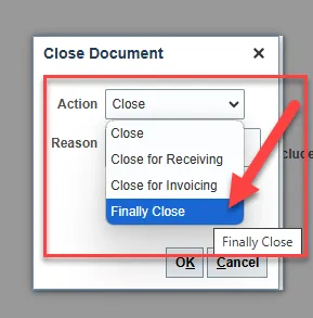 Step 7. Close Document window will be displayed, click on the Action dropdown and select Finally Close and enter an appropriate reason for finally closing the PO. Click OK.