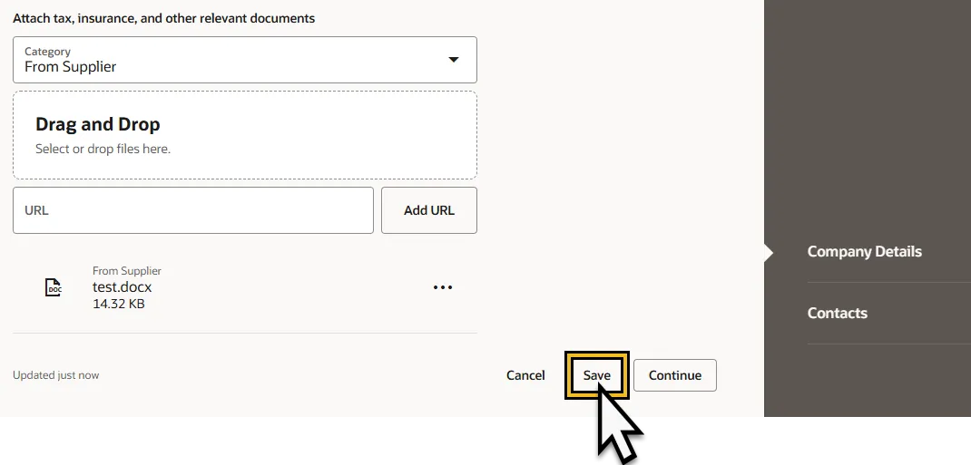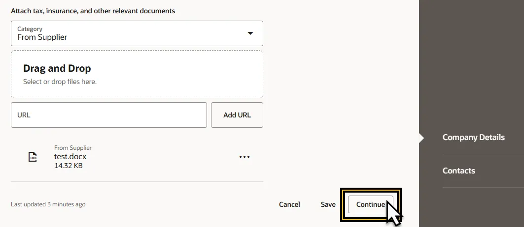 Step 8. Click the Drag and Drop field to select files to attach with the new supplier registration. Examples of documents that may be attached are Tax, Insurance, and other relevant documentation.