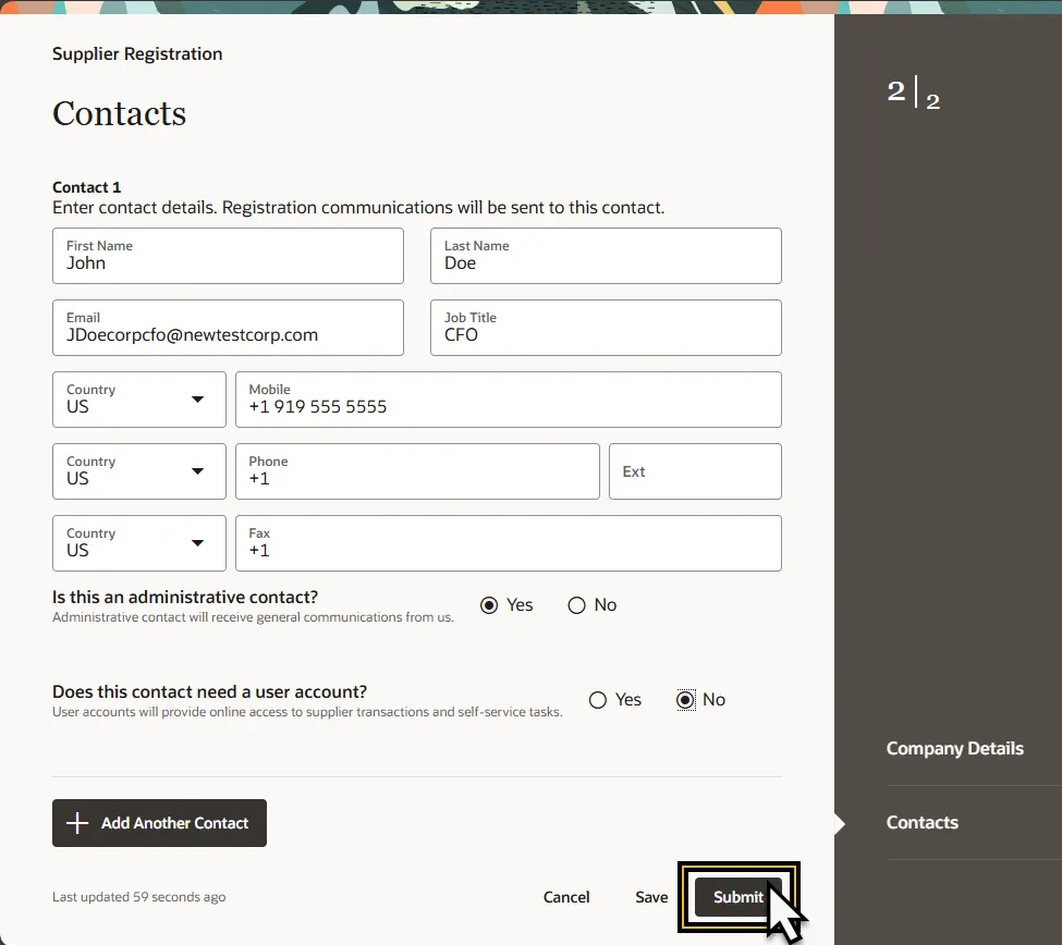 Step 12. Enter the required information into the Contacts page. The registration communications will be sent to the individual entered in the Contacts details page.