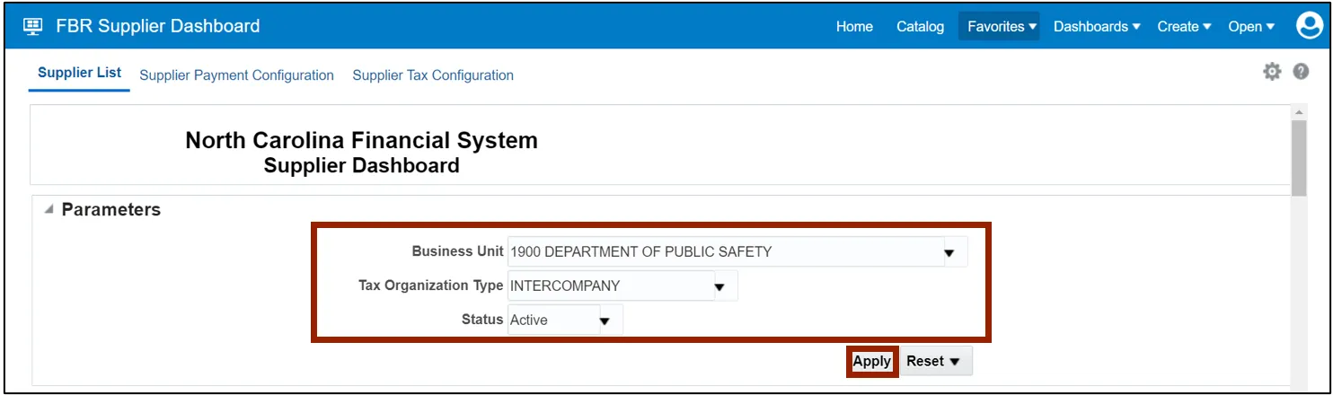 Step 10. In the Parameters section of the Supplier List tab, select the required parameters from the respective drop-down choice lists to filter the supplier list, and click the Apply button.